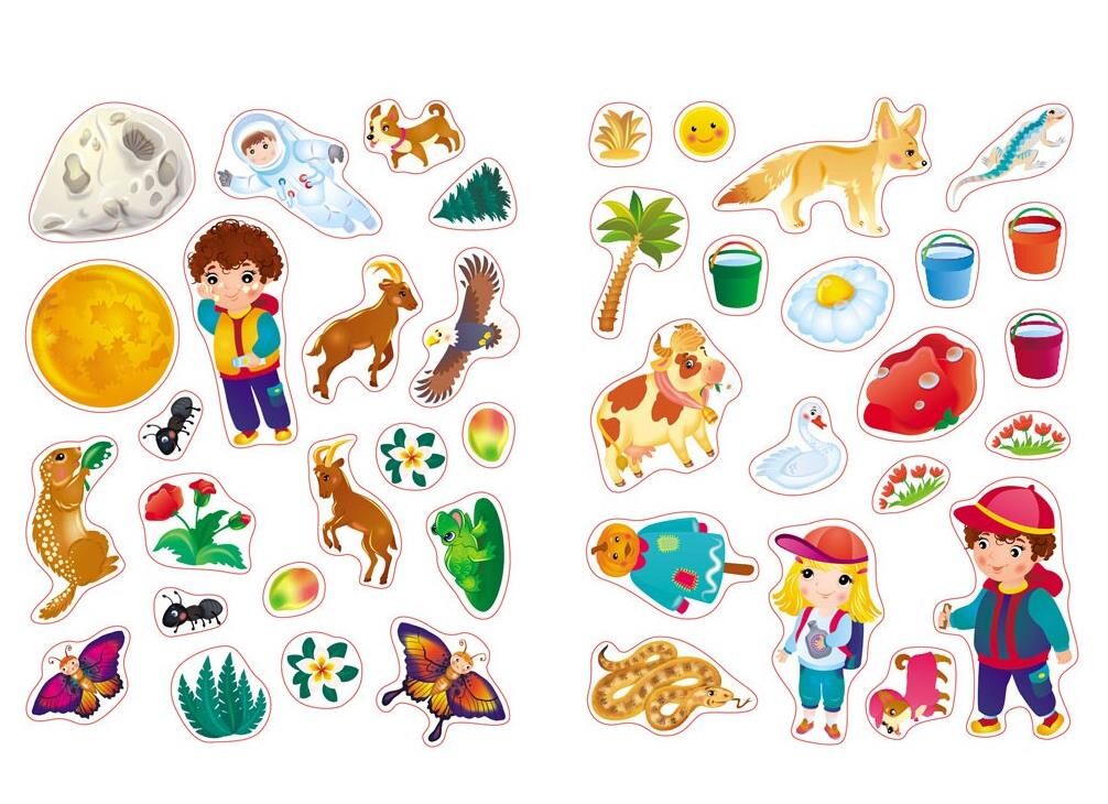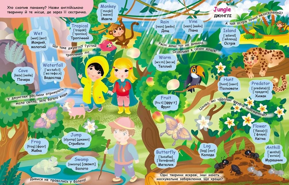 40 наліпок + 4 розвороти-віммельбухи (космос, пустеля, джунглі, тропічний острів) = мозок дитини будує "карту планети", вчиться розрізняти природні зони, розуміти різноманіття світу. Англійська + географія + кругозір в одній книзі!