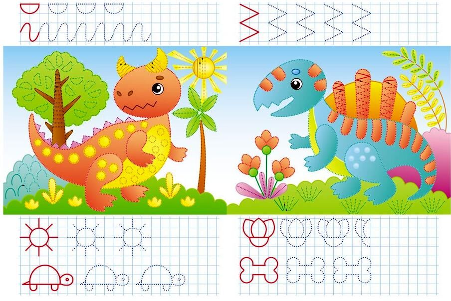 Кожна сторінка наповнена веселими та захоплюючими вправами із зображеннями милих динозавриків.