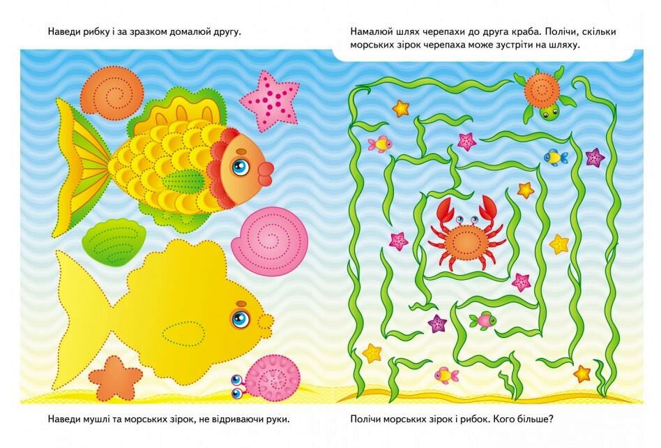 З одного боку — класичні розвивальні завдання: пошук відмінностей між тваринами на фермі, лабіринт до свійської тварини, з'єднати малюків з батьками. З іншого — унікальне для дошкільних прописів завдання: розпізнати емоції дітей на малюнку і обвести тих, у кого гарний настрій. Це формує стійкі нейронні зв'язки між зоровим сприйняттям і розумінням емоційних станів.