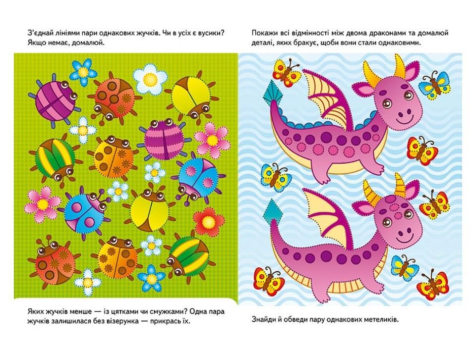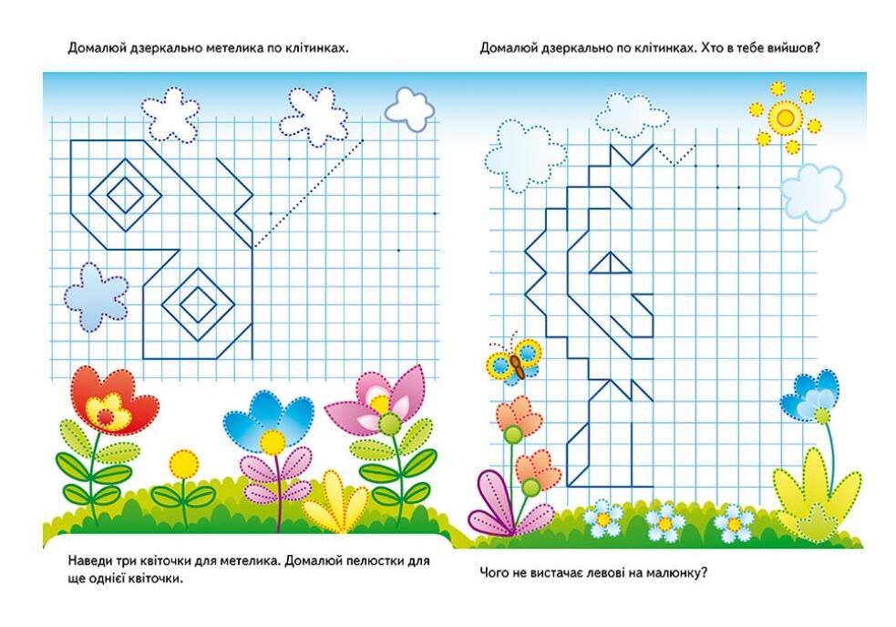 Як це працює: дитина бачить половину малюнка (метелик, будинок, фігура) і має намалювати другу половину дзеркально, клітинка за клітинкою. Для цього мозок виконує одночасно три операції: зорово зчитує форму, трансформує її у дзеркальне відображення і передає руці точні координати руху.
