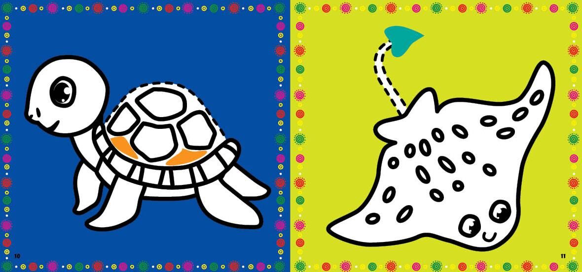 Видання містять великі чорно-білі картинки, які потрібно домалювати по пунктиру, розфарбувати й доповнити яскравими наліпками. Контрастні фони малюнків із певними акцентними кольорами допоможуть малюками навчитися краще фокусувати погляд, а щоб маленькі пальчики почувалися впевненіше, усі зображення виконані товстим контуром. Робота із серією потренує графомоторику, розвине зорове сприйняття та творчі здібності дитини, а також допоможе розпочати знайомство з прописами.