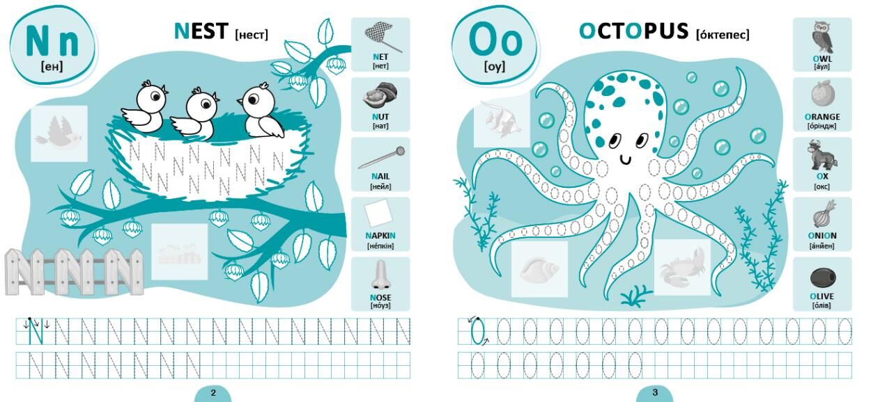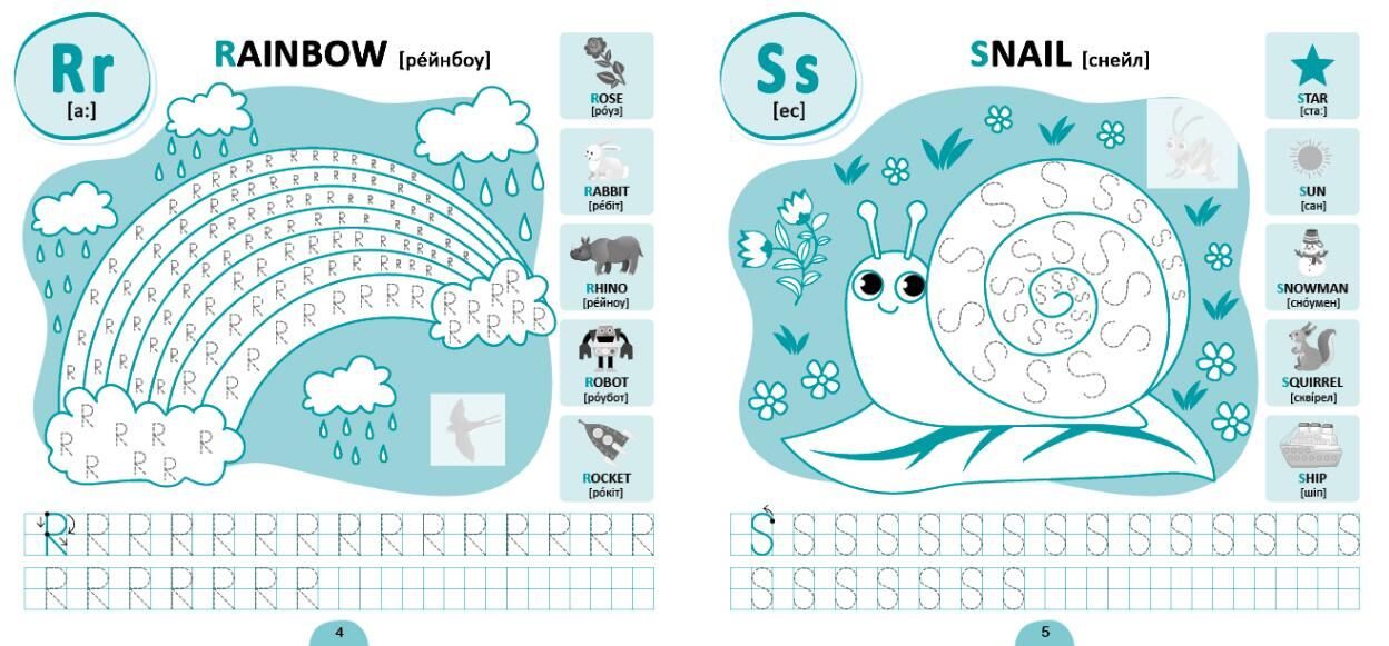 Цей зошит містить прописи букв англійського алфавіту. На кожній сторінці на дитину чекає асоціативний малюнок до літери, який потрібно навести по пунктиру й розфарбувати, а ще — прописи зі зразком написання певної букви та слова, що поповнять лексичний запас англійської мови. Урізноманітнять роботу з виданням тематичні наліпки та цікаві завдання, які допоможуть перевірити знання нових слів, графічного зображення літер та уміння їх писати.