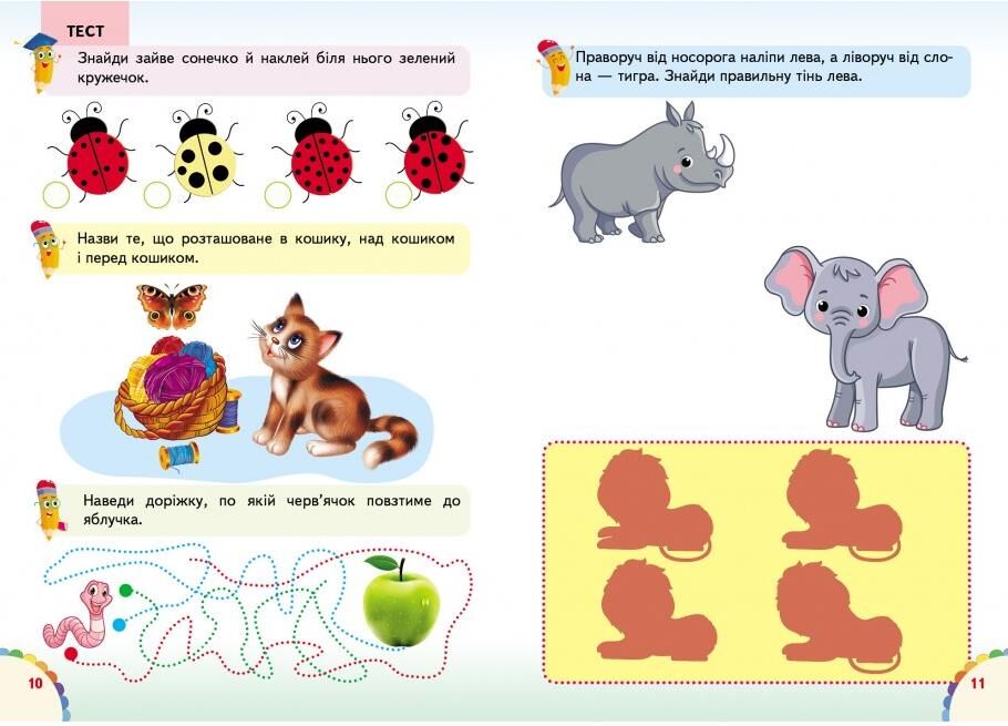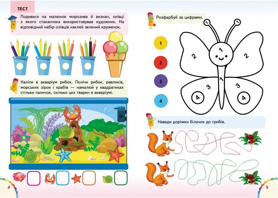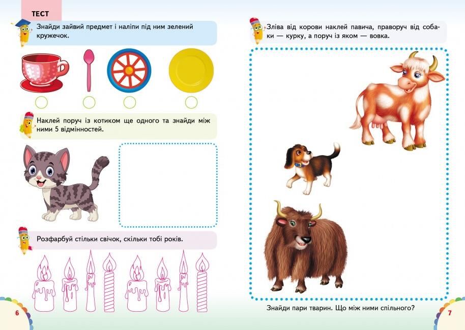 - Дитина буде шукати зайві предмети, знаходити пари, розв'язувати лабіринти і розфарбовувати за цифрами.