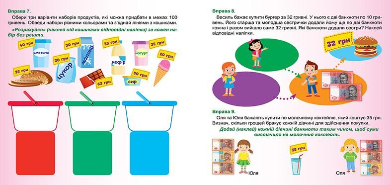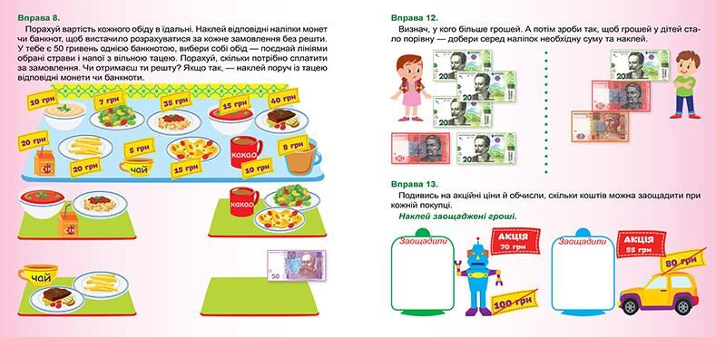 Книжка допоможе учням навчитися ефективно розпоряджатися власними коштами. Завдяки цікавим завданням із наліпками діти зможуть ознайомитися з монетами й банкнотами, здійснювати операції з грошима в уявному процесі купівлі-продажу. А також планувати свій бюджет, заощаджувати, оптимізувати витрати. Це не тільки захоплююче, а й дуже корисне заняття, адже фінансова грамотність – це навичка, якою має володіти кожна людина.