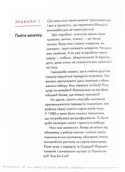 Не так уже й багато в житті задоволень, кращих за келих чудового вина. Але для декого радість від напою затьмарюється муками вибору і численними правилами та забобонами від так званих експертів. Ця книжка допоможе вам відкинути складнощі й навчитися головного — як без перешкод насолоджуватися прекрасним винаходом людства. Не зациклюватися на вартості, бо вона не завжди гарантує якість; не боятися ставити питання консультантам у магазині й сомельє в ресторані; не піддаватися впливу моди та брендів, а обирати саме те, що до вподоби вам. Перегорнувши останню сторінку, ви зможете як профі відкоркувати пляшку найкращого саме для вас вина, розлити його у правильний посуд і влаштувати з друзями незабутній вечір у себе вдома або запросити їх до ресторану і здивувати своїми знаннями винолюба.