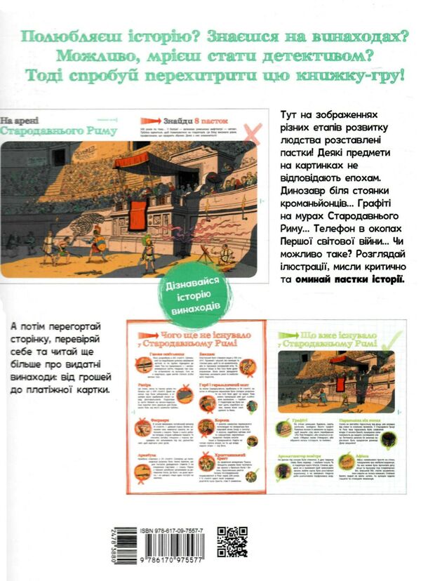 Книга "Пастки історії" - це і енциклопедія, і вимельбух, і гра на логіку. Тут на зображеннях різних етапів розвитку людства розставлені пастки! Деякі предмети на картинках не відповідають епохам, наприклад, рація під час Першої світової війни. Озброївшись уважністю та логікою, дитина обійде всі тимчасові невідповідності.
