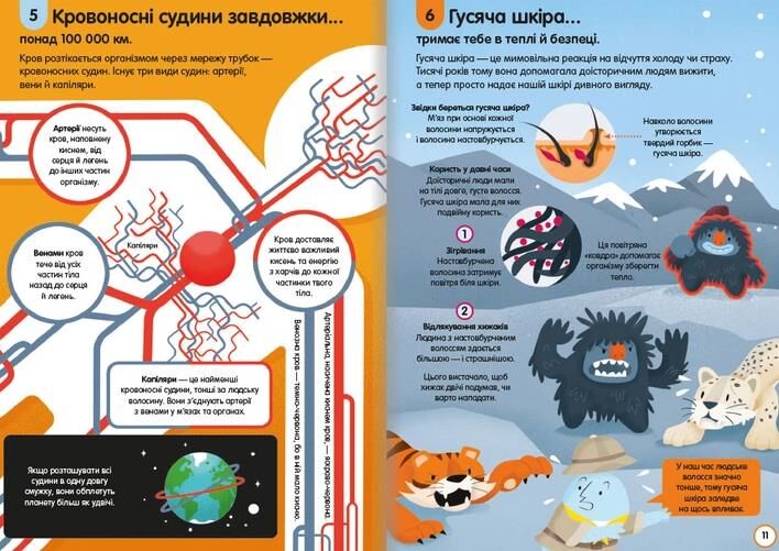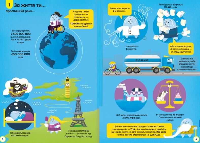 Виявляється, є два типи сліз, за життя людина витрачає на сон 23 роки життя, вдихає 650 мільйонів разів, у неї виростає 950 км волосся, це відстань від Парижа до Лондона і назад. Людина скидає протягом життя 45 кг шкіри, а слини виділяє стільки, що можна заповнити бензовоз, а на шкірі нашого обличчя живуть тисячі павукоподібних. Зуби – міцніші за сталь, а якщо тренуватись, то можна затримати дихання на 20 хв, а щоб найкраще щось вивчити слід лягти спати, під час сну мозок пригадує все вивчене протягом дня. З цією книжкою можна організувати вікторини у школі чи вдома.