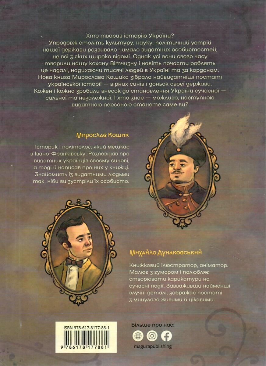 Хто творив історію України? Окрім найпопулярніших персоналій, культуру, науку, політику нашої держави упродовж століть розвивало чимало видатних особистостей, не всі з яких широко відомі. Однак усі вони свого часу творили нашу кохану Вітчизну і здатні робити свій внесок надалі, надихаючи тисячі людей в Україні та за кордоном. Нова книга Мирослава Кошика зібрала найвидатніші постаті української історії — вірних синів і доньок своєї держави. Усі вони зробили внесок до України сучасної — сильної та незалежної. І хто знає, можливо, наступною видатною персоною.