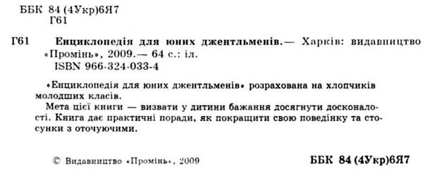 Видання містить 64 сторінки корисної інформації для майбутніх джентльменів і розрахована на хлопчиків молодших класів. Мета цієї книги - викликати у дитини бажання досягти досконалості. Книга дає практичні поради, як поліпшити свою поведінку і відносини з оточуючими. Ця книга допоможе юним джентельмен стати більш привабливими, підкаже, як правильно говорити, одягатися, допоможе правильно спілкуватися, щоб не уникати неприємних ситуацій. Звичайно, одна книга не може дати раду на кожну життєву ситуацію, однак вона підкаже, на що потрібно звернути увагу в першу чергу. Після прочитання книги дитина вже сама зможе вибрати для себе, на що увагу звертати більше або менше, що буде цікаво саме для нього. Читаючи енциклопедію, дитина починає розуміти, що багато в житті залежить саме від неї, книга має повчальний характер, оскільки вчить в дитині виховувати особистість, навчить дитину відповідати за свої вчинки і тд. Саме це допоможе йому закласти міцний фундамент свого успішного майбутнього.
