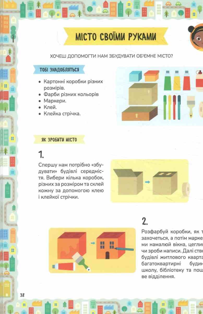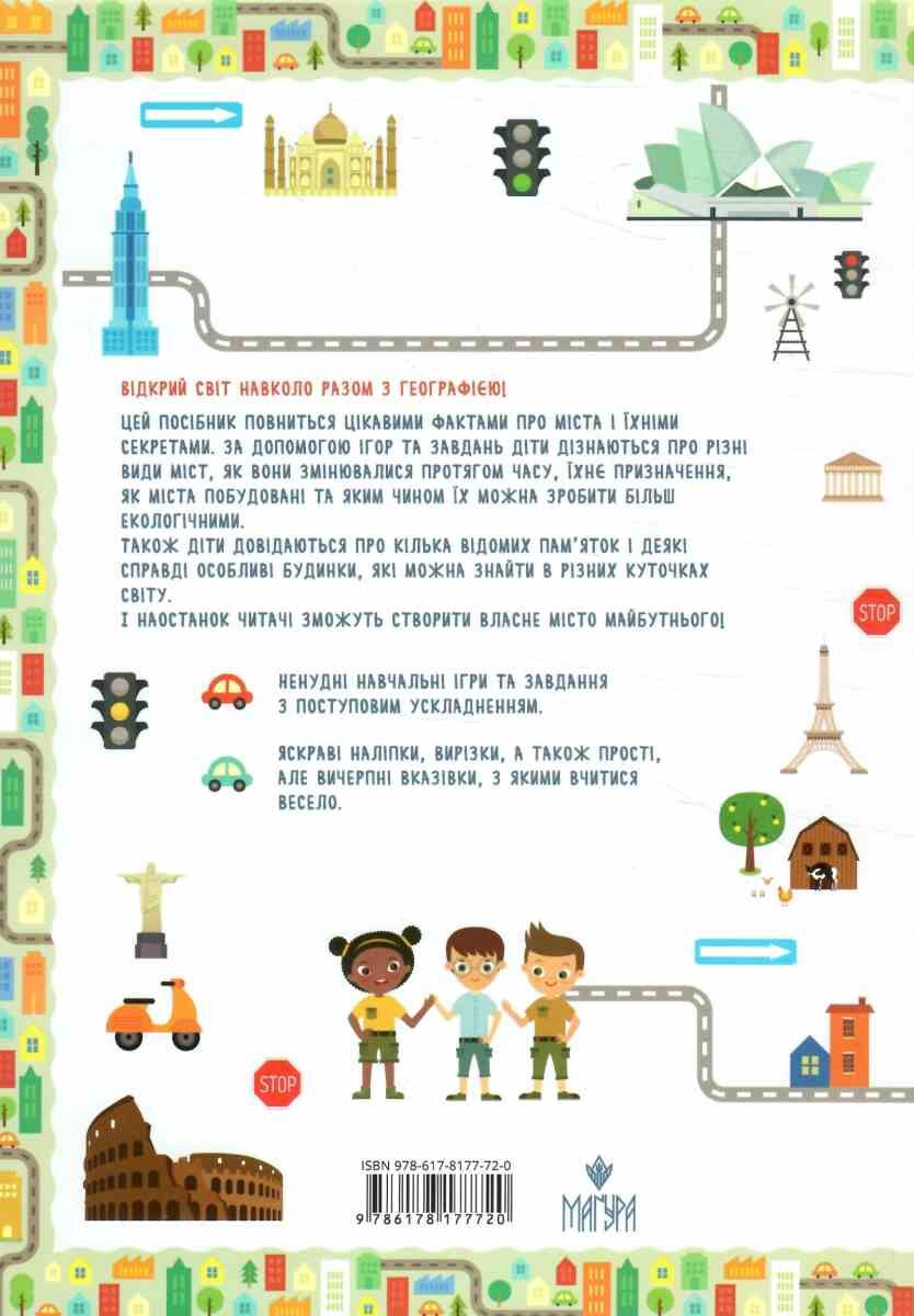 Відкрий світ навколо разом з географією! Цей посібник повниться цікавими фактами про міста і їхніми секретами. За допомогою ігор та завдань діти дізнаються про різні види міст, як вони змінювалися протягом часу, їхнє призначення, як міста побудовані та яким чином їх можна зробити більш екологічними. Також діти довідаються про кілька відомих пам’яток і деякі справді особливі будинки, які можна знайти в різних куточках світу. І наостанок читачі