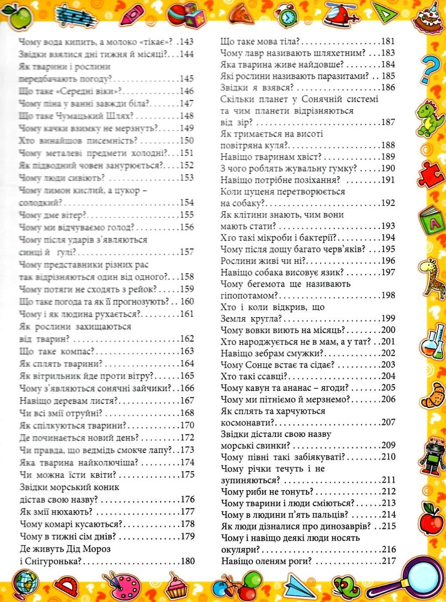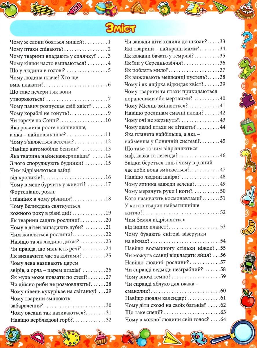 Ніхто не заперечує, що у світі дуже багато різноманітних цікавинок, але тільки маленькі діти можуть сформулювати своє питання так, що воно само по собі претендує на приз за оригінальність. Саме у ракурсі дитячого сприйняття світу зібрані всі статті цієї енциклопедії. Із її допомогою дорослі із легкістю пояснять наприклад таке: «Чим відрізняються зайці від кроликів?», «Чи правда, що міль їсть речі?», «Чому очі не мерзнуть?», «Чому півень кукурікає на світанку?», «Як підводний човен занурюється?», «Як вітрильник йде проти вітру?», «Чи знають тварини, котра година?» та багато-багато іншого.