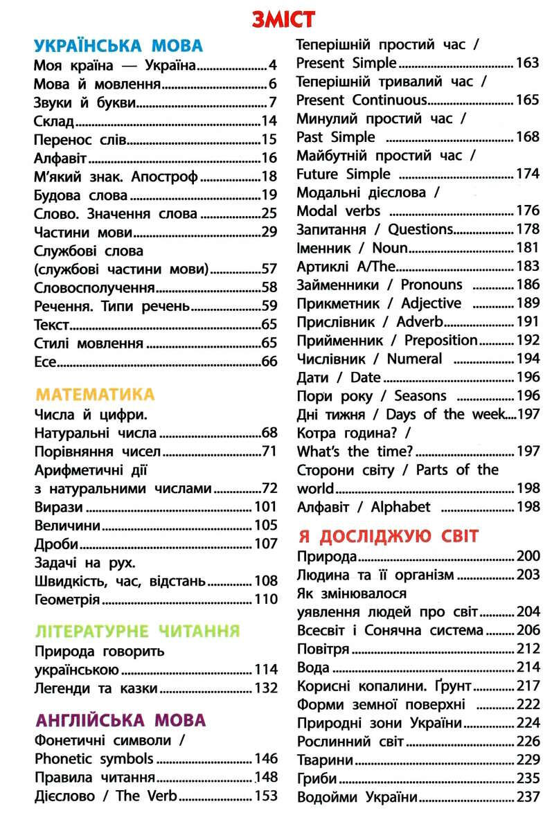 Посібник містить основні правила та теми з української та англійської мов, математики, я досліджую світ, а також цікаві тексти для літературного читання.