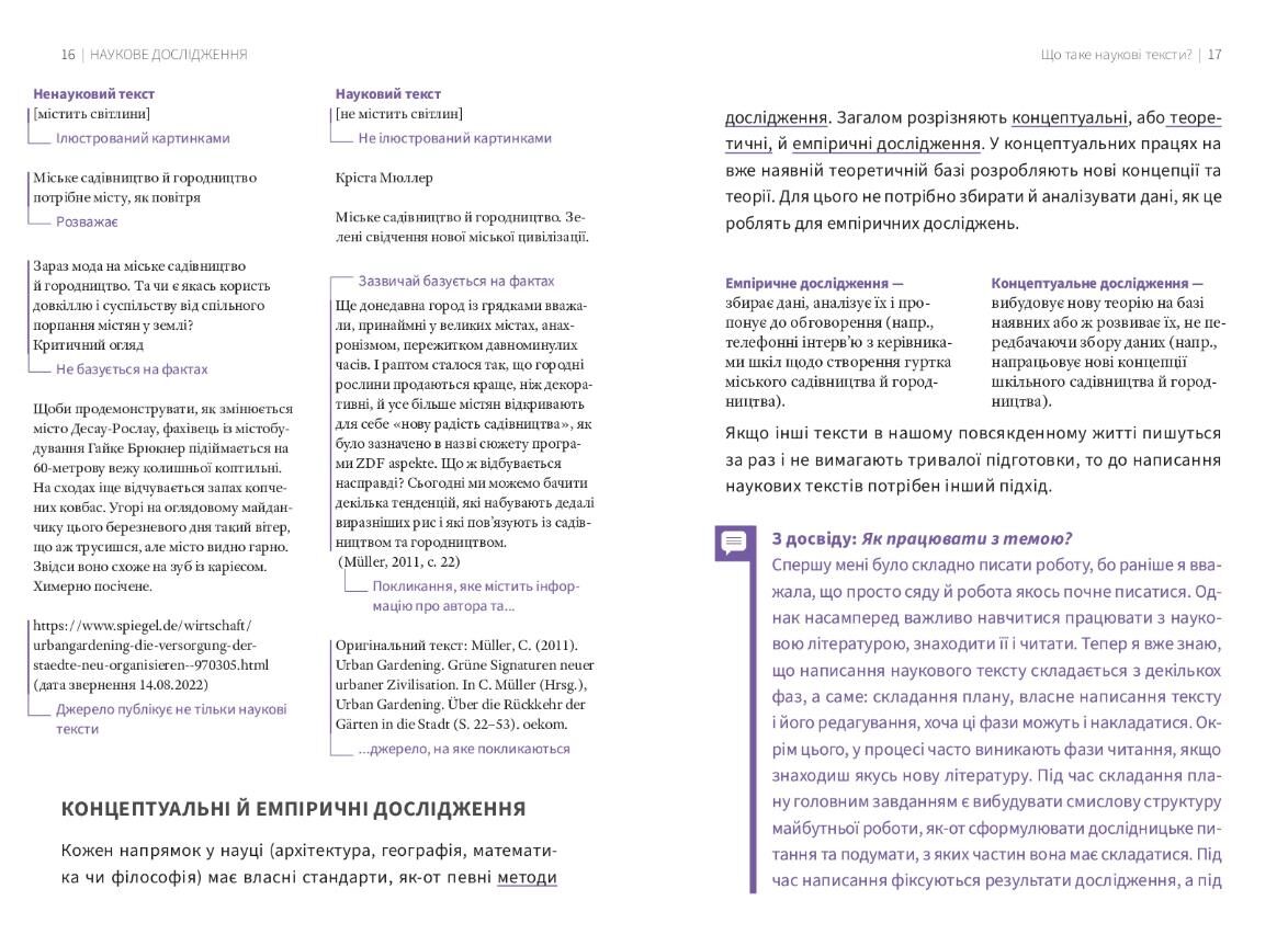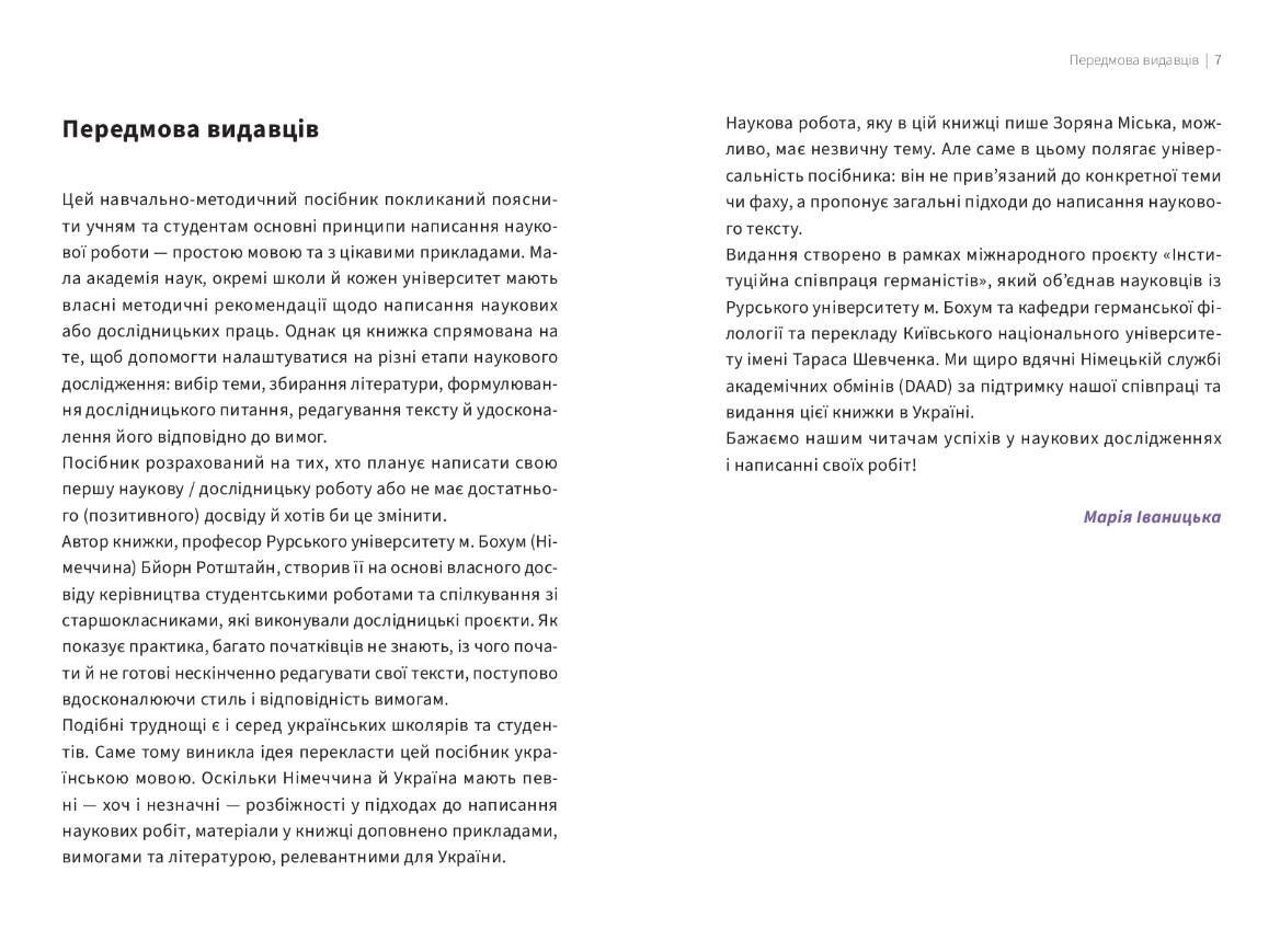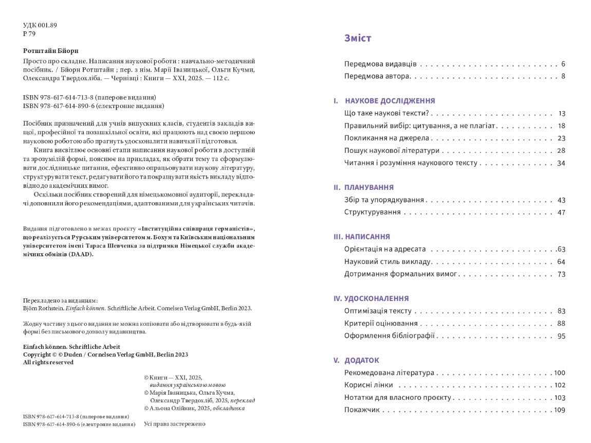 Посібник призначений для учнів випускних класів, студентів закладів вищої, професійної та позашкільної освіти, які працюють над своєю першою науковою роботою або прагнуть удосконалити навички її підготовки.Книга висвітлює основні етапи написання наукової роботи в доступній та зрозумілій формі, пояснює на прикладах, як обрати тему та сформулювати дослідницьке питання, ефективно опрацьовувати наукову літературу, структурувати текст, редагувати його та покращувати якість викладу відповідно до академічних вимог.Оскільки посібник створений для німецькомовної аудиторії, перекладачі доповнили його рекомендаціями, адаптованими для українських читачів.