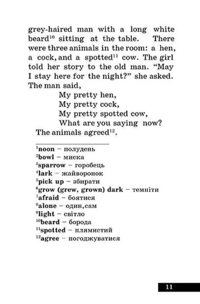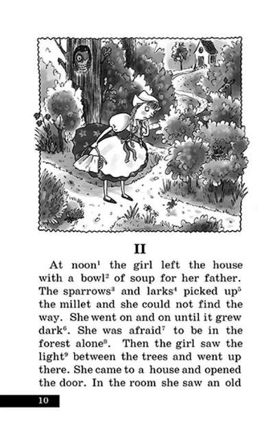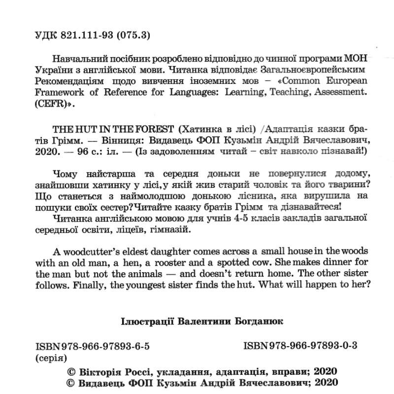 Книга для читання з вправами (А2, Elementary1, 4-5 клас). Чому найстарша та середня доньки лісника не повернулися додому, знайшовши хатинку у лісі, у якій жив старий чоловік та його тварини? Що станеться з наймолодшою донькою, яка вирушила на пошуки своїх сестер? Читайте казку братів Грімм та дізнавайтеся!