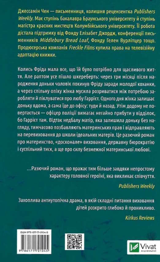 Колись Фріда мала все, що їй було потрібно для щасливого життя. Але раптом усе пішло шкереберть: через три місяці після народження доньки чоловік покинув Фріду заради молодої коханки, а через спільну опіку жінка мусила розриватися між потребою заробляти й піклуватися про любу Гаррієт. Одного дня жінка залишає доньку вдома, а сама їде до офісу: туди й назад. Утім додому не повертається — офіцер поліції вимагає негайно прибути у відділок, бо Гаррієт там. Відтак недбалу матір, яка залишила доньку без нагляду, тимчасово позбавляють материнських прав і відправляють на перевиховання до школи ідеальних матерів. Це разючий роман про материнство, «досконале» виховання, державну бюрократію і суспільний тиск, а ще про силу безмежної материнської любові.