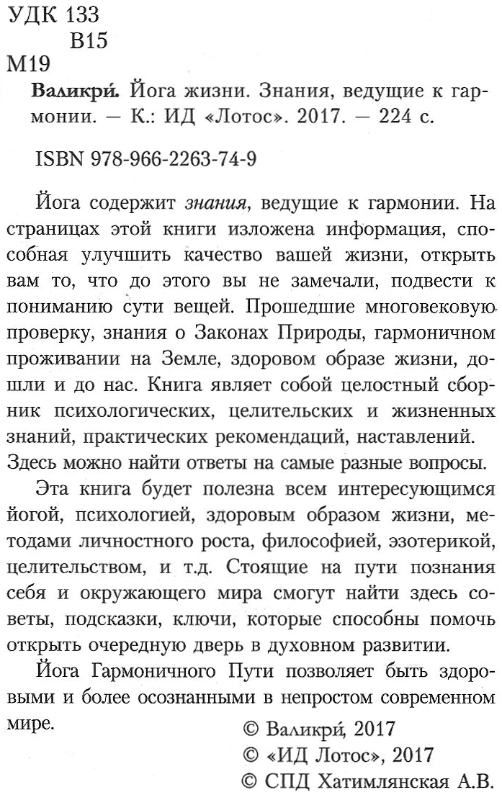 Йога містить знання, що ведуть до гармонії. На сторінках цієї книги викладено інформацію, здатну покращити якість вашого життя, відкрити вам те, що до цього ви не помічали, підвести до розуміння суті речей. Знання про Закони Природи, гармонійне проживання на Землі, здоровий спосіб життя, що пройшли багатовікову перевірку, дійшли і до нас. Книга є цілісною збіркою психологічних, цілительських і життєвих знань, практичних рекомендацій, настанов. Тут можна знайти відповіді на різні питання. Ця книга буде корисна всім, хто цікавиться йогою, психологією, здоровим способом життя, методами особистісного зростання, філософією, езотерикою, цілительством, і т.д. Ті, хто стоїть на шляху пізнання себе і навколишнього світу, зможуть знайти тут поради, підказки, ключі, які здатні допомогти відкрити чергові двері в духовному розвитку. Йога Гармонічного Шляху дозволяє бути здоровими та усвідомленішими в непростому сучасному світі.