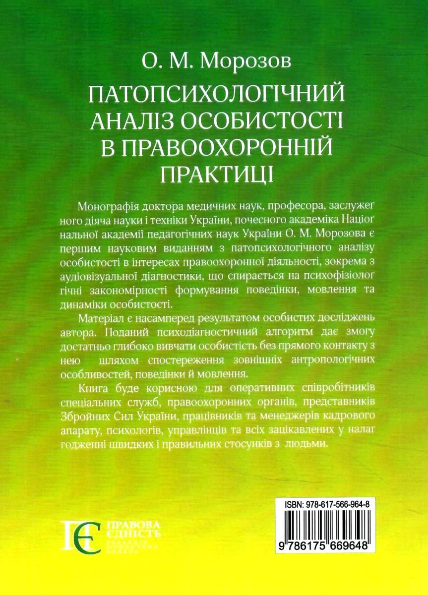 Монографія доктора медичних наук, професора, заслуженого діяча науки і техніки України, почесного академіка Національної академії педагогічних наук України О. М. Морозова є першим науковим виданням з патопсихологічного аналізу особистості в інтересах правоохоронної діяльності, зокрема з аудіовізуальної діагностики, що спирається на психофізіологічні закономірності формування поведінки, мовлення та динаміки особистості. Матеріал є насамперед результатом особистих досліджень автора. Поданий психодіагностичний алгоритм дає змогу достатньо глибоко вивчати особистість без прямого контакту з нею шляхом спостереження зовнішніх антропологічних особливостей, поведінки й мовлення. Книга буде корисною для оперативних співробітників спеціальних служб, правоохоронних органів, представників Збройних Сил України, працівників та менеджерів кадрового апарату, психологів, управлінців та всіх зацікавлених у налагодженні швидких і правильних стосунків з людьми.