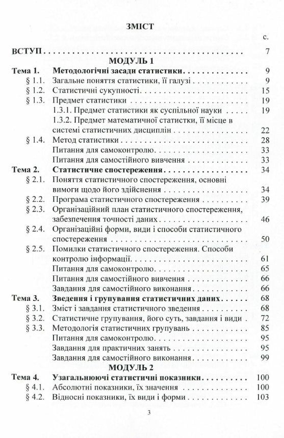 Розглядаються теми освітньо-професійної програми (2010 р.) навчального курсу «Статистика» економічних факультетів вищих навчальних закладів. Висвітлено питання математичної статистики і загальної теорії статистики в модульному варіанті з програмованою формою контролю знань. Посібник передбачає індивідуальний самоконтроль засвоєних знань студентами в розрізі тем. Застосована лінійна комбінована програма контролю знань, а саме ті її варіанти, коли студент повинен знайти правильну відповідь із кількох відповідей і перейти до вивчення наступного фрагмента тексту. Поточний контроль здійснюється на базі відповідей, розташованих на полях кожної сторінки посібника, а також по тексту книги, де в дужках подано два варіанти відповіді (одна вірна). При цьому крім поточного контролю, матеріал посібника містить підсумковий контроль знань. Теоретичний курс навчального посібника, а також тести підсумкового контролю знань і окремі поточного підготував доктор економічних наук, професор Опря А.Т., питання для самостійного вивчення, самоконтролю знань - кандидат економічних наук, доцент Дорогань-Писаренко Л.О., програмований поточний само¬контроль знань – кандидат економічних наук, доцент Кононенко Ж.А., завдання для практичних занять – кандидат економічних наук, доцент Єгорова О.В. Призначено для студентів, які навчаються за спеціальностями напряму 0501 «Економіка і підприємництво».
