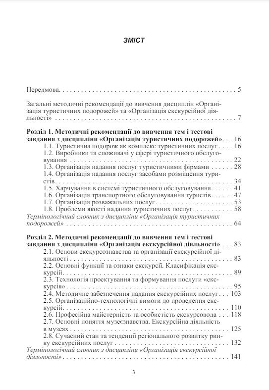 Навчальний посібник «Організація туристичних подорожей та екскурсійної діяльності», розроблений відповідно до робочих програм дисциплін «Організація туристичних подорожей» і «Організація екскурсійної діяльності», містить: навчально-тематичні плани дисциплін, вказівки до вивчення конкретних тем із запитаннями для самоконтролю, тести та вимоги щодо виконання обов’язкових і вибіркових індивідуальних завдань, порядок проведення підсумкового модульного контролю (ПМК), критерії оцінювання знань студентів, список рекомендованих джерел інформації та термінологічний словник. Навчальний посібник пропонується для студентів вищих навчальних закладів, які готуються працювати в галузі туризму, викладачів, фахівців сфери туристичних та екскурсійних послуг.