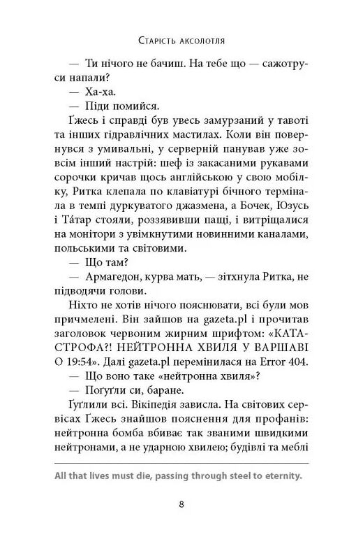 Дивовижний і захопливий постапокаліптично-кіберпанковий роман Яцека Дукая, одного з найтитулованіших сучасних польських фантастів. За один день випромінювання невідомого походження — Промінь Смерті, огинаючи земну кулю, знищує на ній весь живий білок, і лише поодинокі люди встигають скопіювати свій зісканований через нейрософт розум на сервери і сховища. Відтак світ належить мехам і ботам, «поселяючись» у яких оцифровані особи спершу гуртуються, потім розвивають нові цивілізації, а в них і нові форми ідеологій та релігій, створюють політичні альянси, ведуть війни. Та чи випадковим був той Промінь Смерті? Чим стає людина, якщо від неї лишається тільки розум, не втілений органічно? І чи зможе життя на планеті повернутися до своєї докатастрофної біологічної форми?