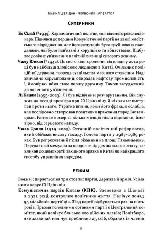 Ця книжка переверне ваше уявлення про Китай і його лідера. Спираючись на два десятиліття роботи репортером у Гонконгу, Майкл Шерідан показує Сі Цзіньпіна не лише як правителя, а як спадкоємця «червоної династії», що виріс у світі жаху, покарань і зради. Автор пояснює, як конкретні події, сталінські доктрини й древні китайські тексти формували світогляд Сі, його недовіру до світу.