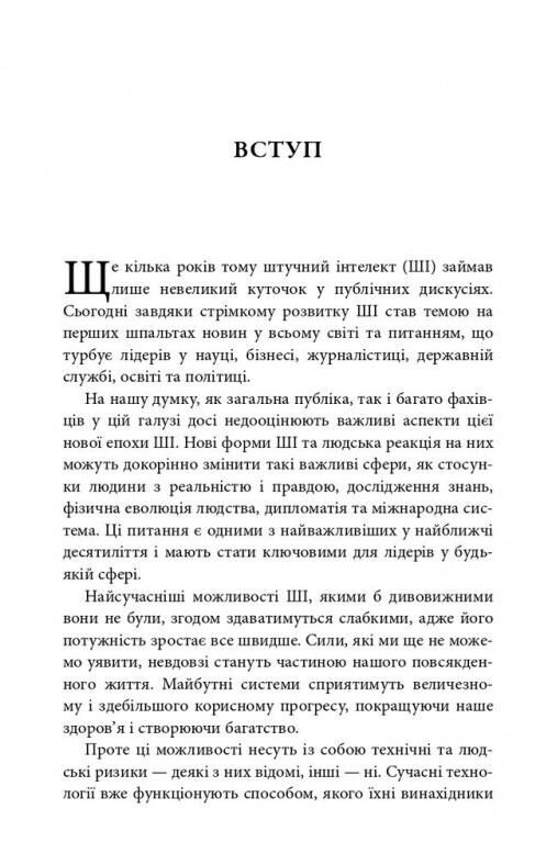 Штучний інтелект допоможе нам розв'язати величезні кризи - від зміни клімату до геополітичних конфліктів і нерівності доходів. Він може розкрити деякі з найбільших таємниць нашого всесвіту, здійснити революцію в таких різноманітних галузях, як медицина й архітектура, та піднести людський дух до неймовірних висот. Але він також створить виклики, з якими ми ще ніколи не стикалися - узурпувавши нашу здатність до незалежного судження й дій, випробовуючи наші відносини з божественним і, можливо, навіть стимулюючи нову фазу людської еволюції. Хто стане провідником нашого виду в цих нетрях?