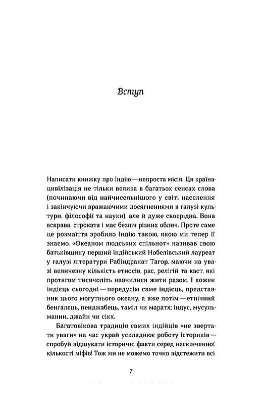 Індія… Традиційна цивілізація та інноваційна держава водночас. Країна, що поєднує, здавалося б, непоєднуване. Ядерні потужності та принципи ненасильства, сучасні мегаполіси та складні релігійні традиції, кастовий поділ суспільства й нанотехнології. У своїй книжці дослідниця Олена Борділовська докладно описує мало не кожен аспект життя Індії, починаючи від перших цивілізацій та прадавніх текстів і до нинішніх днів. Звідки в цивілізації, яка виникла задовго до нашої ери, взялися вентиляція, каналізація та водопостачання? Чому гідний індійський цар не мав спати понад шість годин і чи повинна доброчесна індійська дружина згоріти на погребальному вогнищі свого чоловіка? Як буддисти стали посередниками у спілкуванні доти ізольованої Індії із зовнішнім світом і з якою драмою експедиція Васко да Гами дісталася цієї країни? Відповіді на ці й низку інших запитань про Індію, її історію та культуру авторка дає в цій книжці.