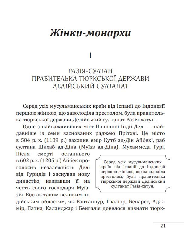 Бахріє Учок (1919—1990) - відома турецька письменниця, дослідниця в різних галузях знань. Книжка про правительок давніх ісламських держав вартувала їй неабияких пошукових зусиль, адже зазвичай тодішні історики нехтували досягненнями володарок і належно їх не фіксували. Слід зазначити, що чи не найбільше змін у соціальному і правовому становищі жінок на мусульманському Сході сталося з появою Корану. Вони набули низки прав і могли за бажання порівняно легко реалізуватися. Тому серед видатних ісламських літераторів, проповідників, науковців та поетів зустрічаються й жіночі імена. Підкорилася їм і царина управління державою. Вступ жінок на престоли ісламських держав розпочався з першої половини XIII ст. У поле зору науковиці потрапили 20 монархинь і 13 регенток, щодо яких встановлено такі ознаки державної влади, як карбування власної монети або згадка імені в п’ятничній молитві, або відомості в письмових джерелах про обіймання престолу. Авторці не вдалося простежити життєвий і «кар’єрний» шлях тільки однієї жінки — володарки острова Малікут, що лежить в Індійському океані на південний захід від Цейлону. Навіть ім’я її досі не вдалося встановити. Також розповіді про жінок доповнені відомостями про їхні держави та тогочасними історичними подіями.