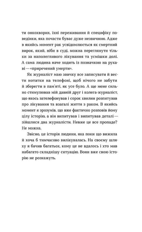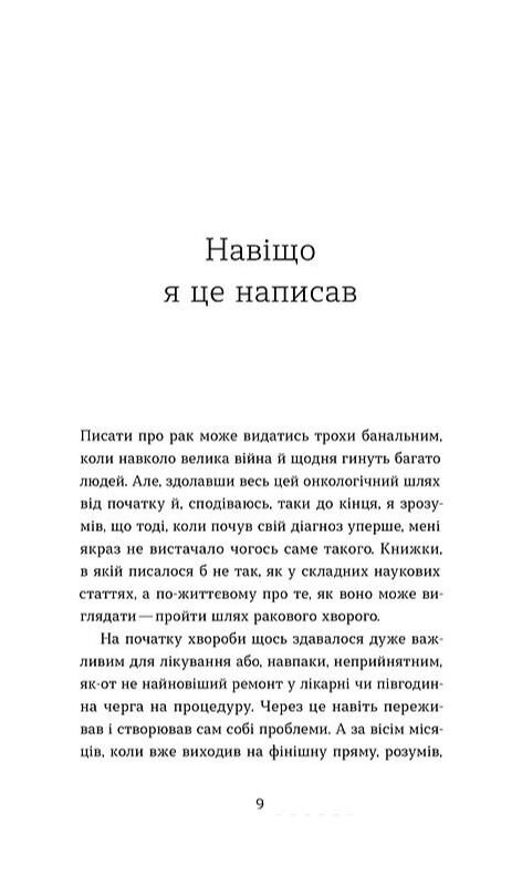 Що робити, коли твоє життя вмить змінюється з діагнозом, і як узагалі лікуватися, коли ракетний обстріл у будь-який момент може перервати процедуру? Як сказати друзям, а потім ще й «вписати» недугу у свій графік? Автор щиро розповідає про те, що відбувалося з ним на кожному етапі боротьби з хворобою, підготуватися до якої неможливо. Віталій ділиться лайфхаками, жартує та пояснює, як краще підтримувати людину, що стикнулася з онкологією.