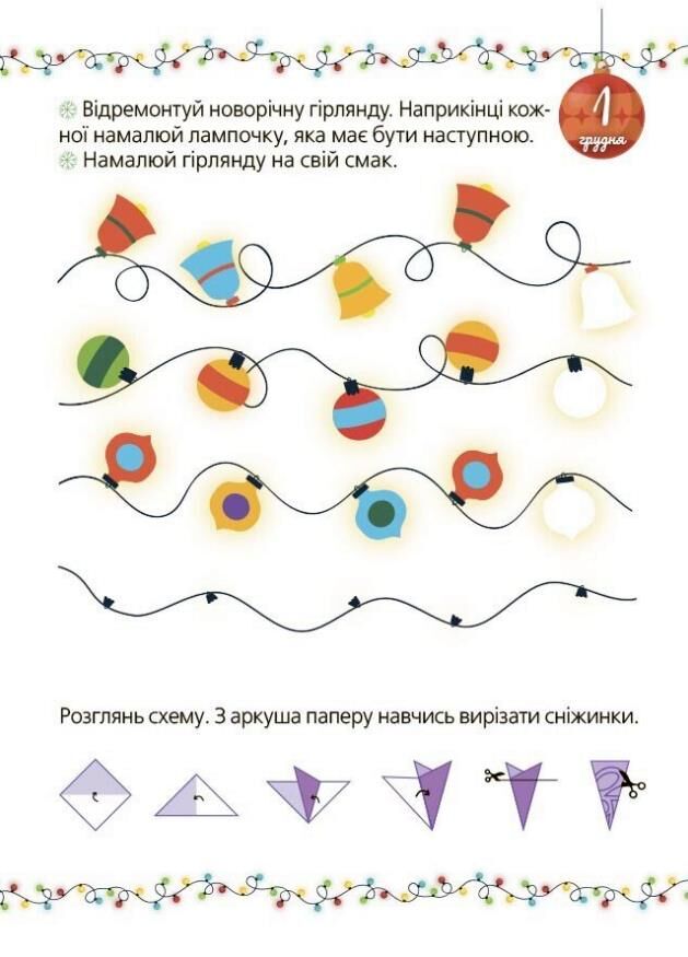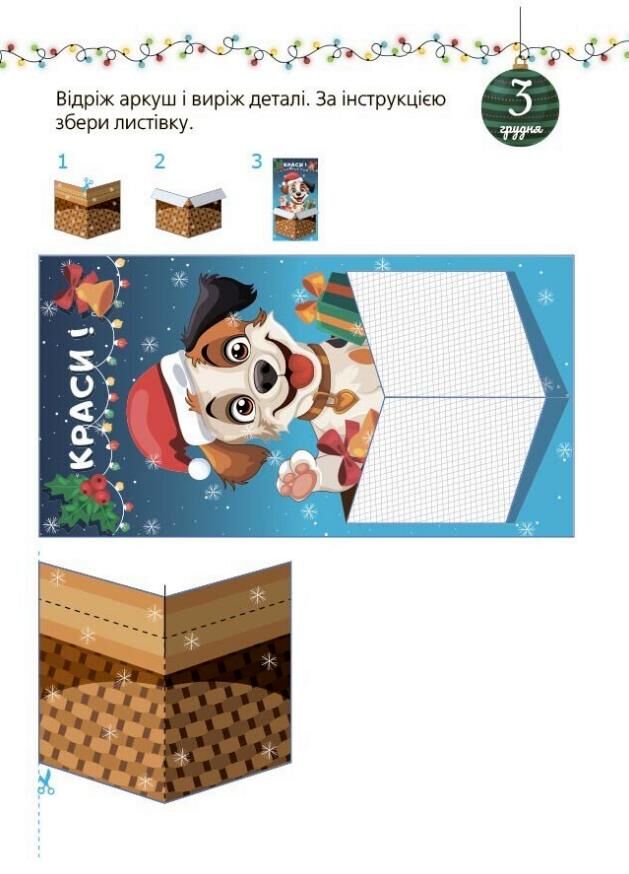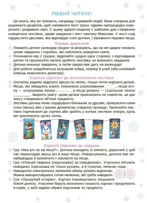 Створюємо дива власноруч та готуємося до зимових свят! Творчий зошит із саморобками та завданнями для дітей 4–6 років! Цей зошит справжній скарб. Перед вами — дитячий простір для творчості, побудований за принципом адвент-видання. На його сторінках на дітей чекають зразок листа святому Миколаю, 15 шаблонів для створення новорічних листівок, цікаві завдання для розвитку дитини та багато корисних ідей для занять у колі близьких та друзів. Наш творчий адвент-зошит допоможе організувати сумісне родинне дозвілля та перетворити очікування свят на справжню зимову пригоду. Розгортайте адвент-зошит та створюйте дива власноруч!