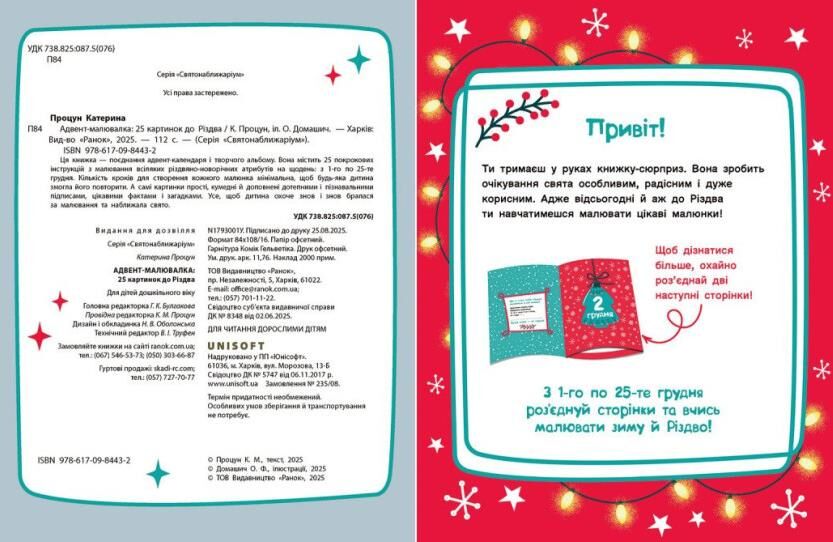 Зимові свята — найочікуваніший час для кожної дитини. Адвент-малювалка: 25 картинок до Різдва авторства Катерини Процун — це яскрава можливість зробити грудень по-справжньому чарівним. Ідея створити творчий день упродовж усього адвенту перетворює очікування Різдва на веселе та пізнавальне заняття.