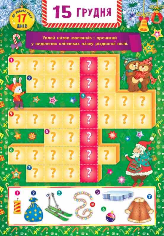 "Разом із цією книжкою малюк підготується до зимових свят та проведе час в очікуванні Нового року цікаво та з користю. Видання містить великий плакат-календар на грудень, творчі й розвивальні завдання на кожен день місяця, 230 яскравих наліпок для виконання завдань і заповнення календаря, а також лист святому Миколаю та лист для планів на наступний рік. Видання призначене для спільної роботи дорослих з дітьми дошкільного та молодшого шкільного віку."