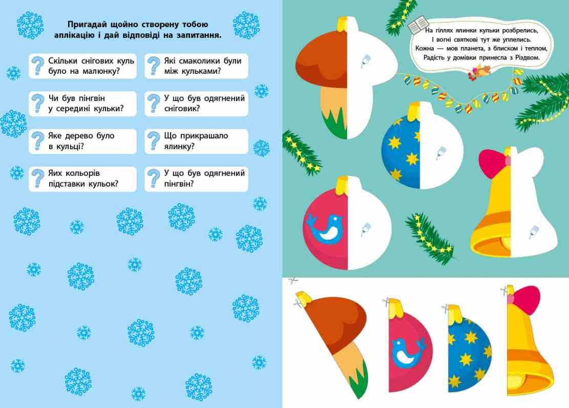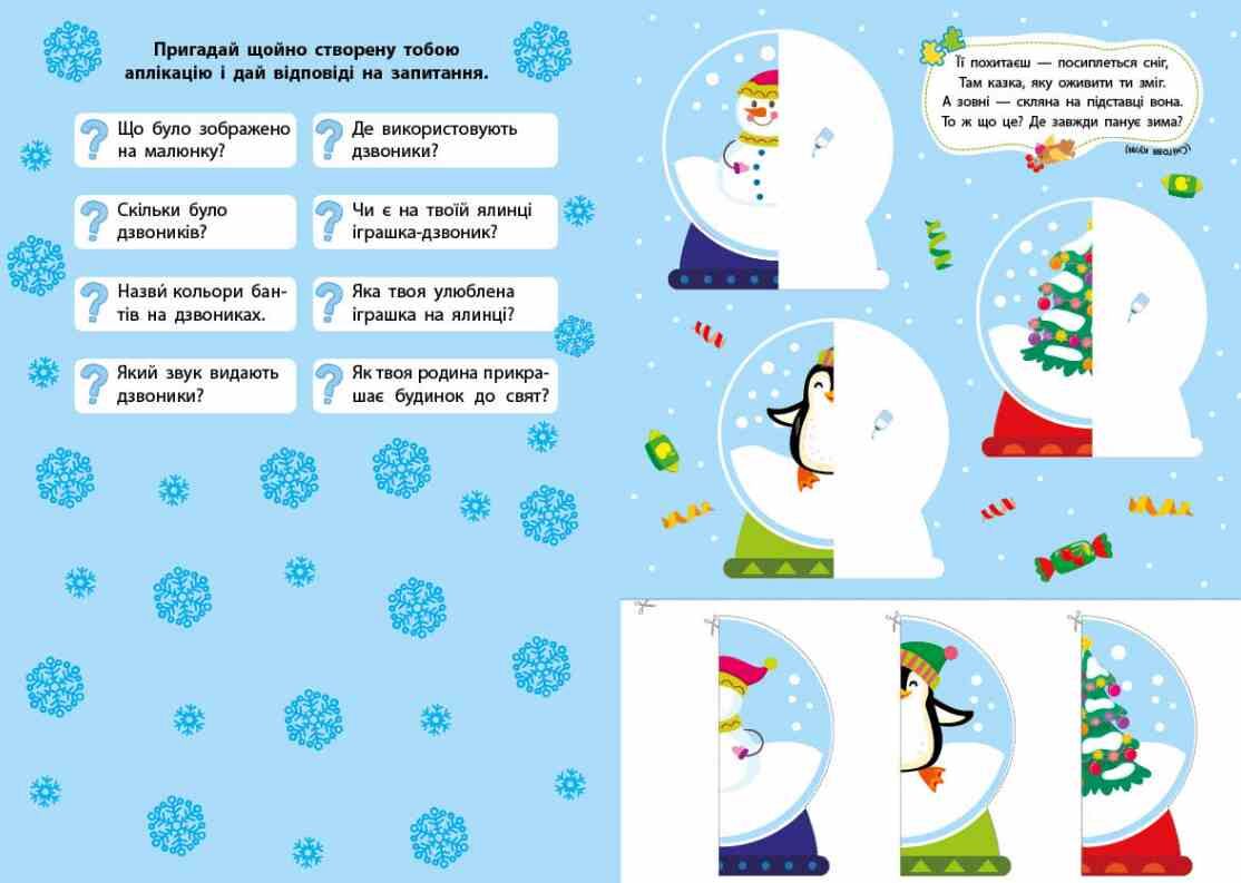 Серія «Зимові аплікації» створена для розвитку творчих здібностей і дрібної моторики маленьких непосидючок. У кожній книжці на малюків чекають святкові зимові ілюстрації, зображення на яких потрібно доклеїти, а ще — віршики й загадки, цікаві питання і наліпки. Книжки серії розвинуть логічне мислення, потренують пам’ять та увагу, виховають посидючість, організують цікаве дозвілля і сформують бажання створювати подарунки рідним і близьким своїми руками.
