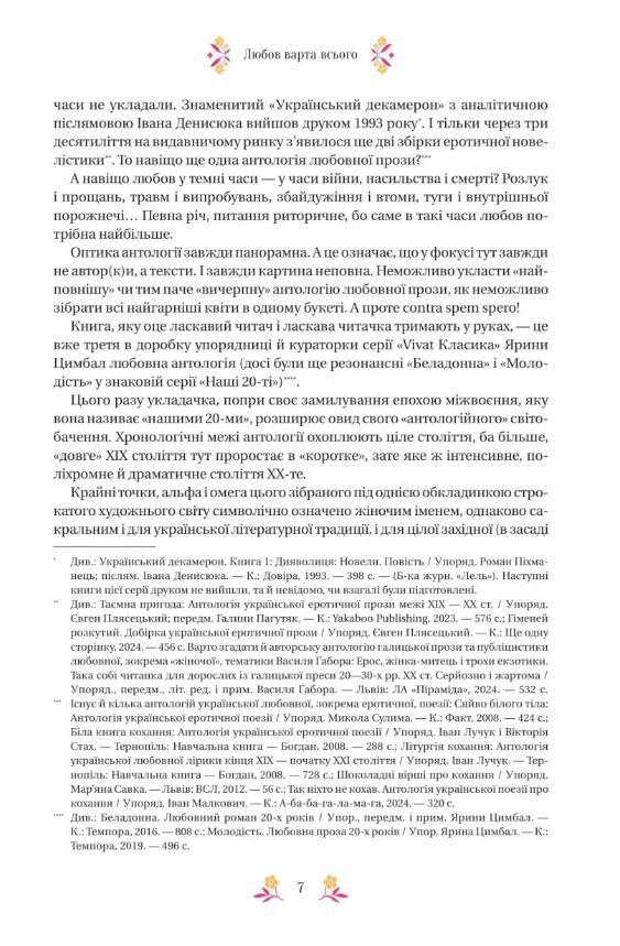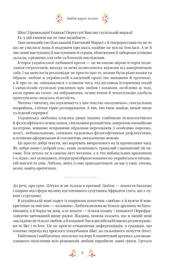 Українська любовна класика захоплює й дивує глибиною психологічного й філософічного осмислення, стильовим розмаїттям, широкою емоційною палітрою, яскравими образами персонажів і персонажок, свіжими рефлексіями, влучними афоризмами й соковитою мовою.