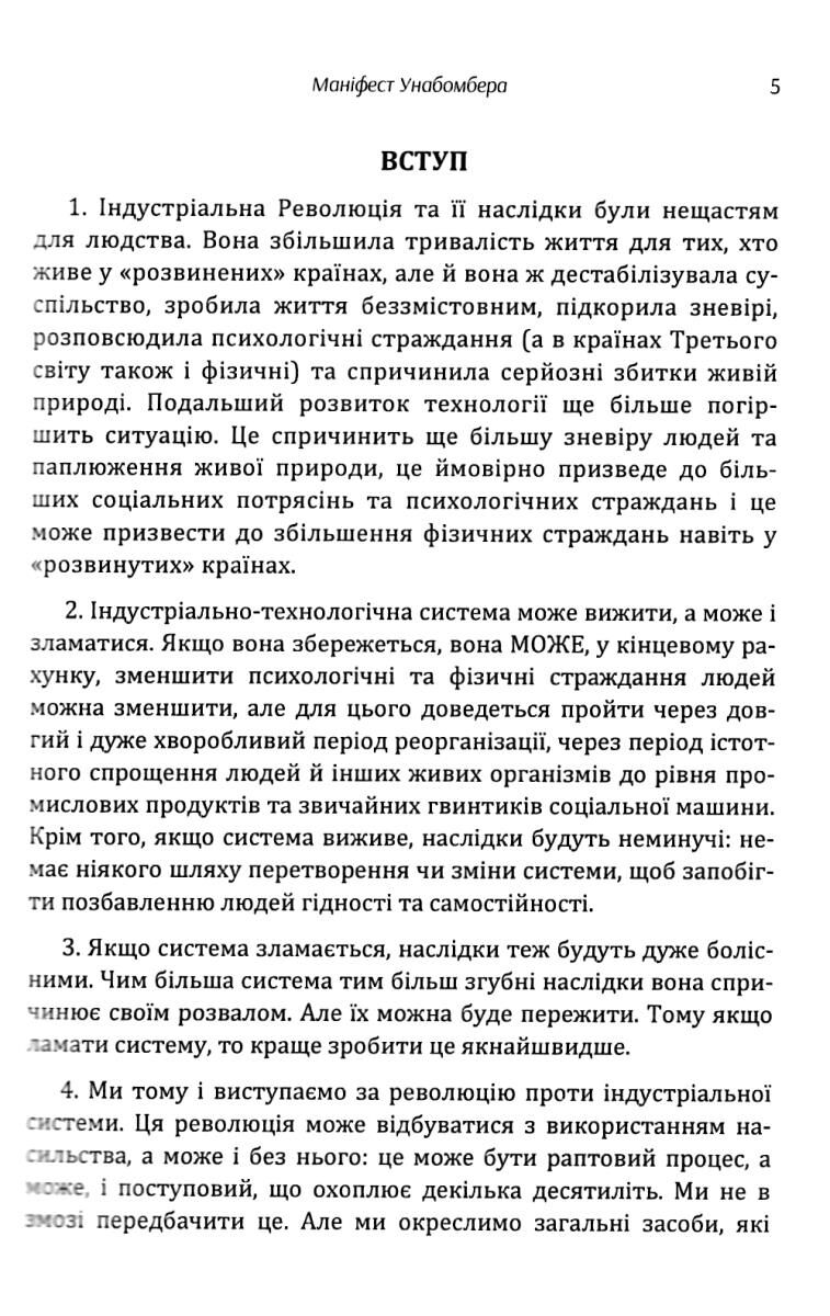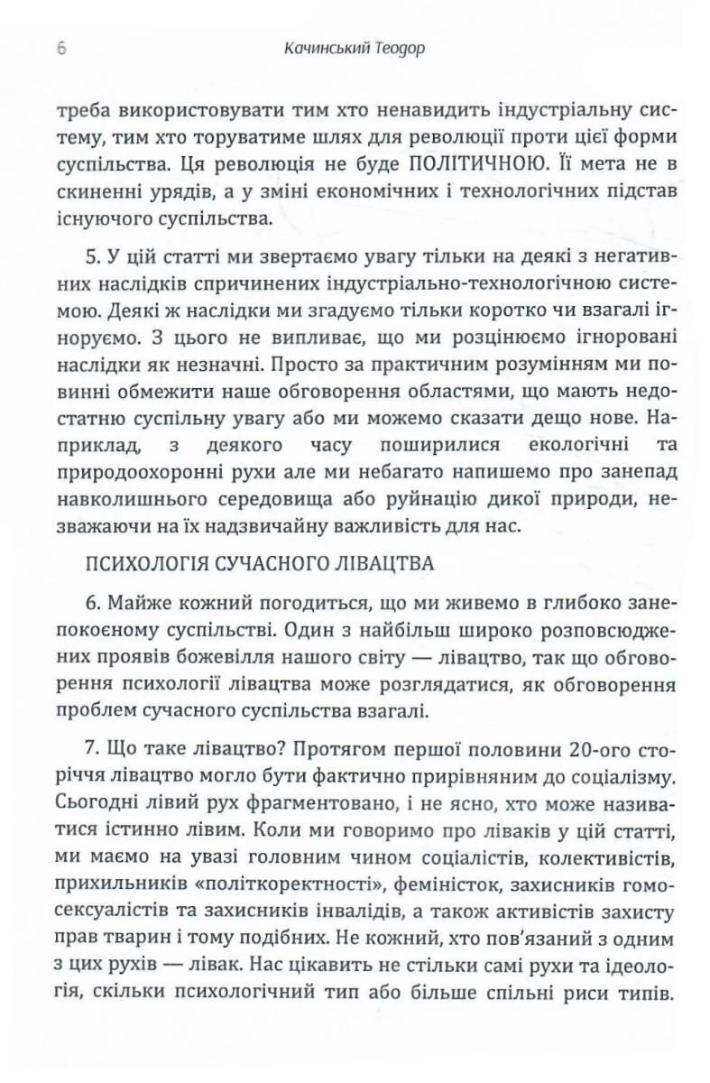 Цей матеріал не написаний спеціально для України і спеціально про Україну. Але тим не менш є надзвичайно цікавим і корисним для українського читача. В першу чергу тому, що показує йому, що Качинський бунтує, у розвинутому "щасливому" суспільстві США, проти тих самих вад, за які українці зненавиділи комуністичну систему. Качинський бунтує проти бездушної, глухої системи, що підминає людину. Систему, для якої людина – лише гвинтик чи шестерня.