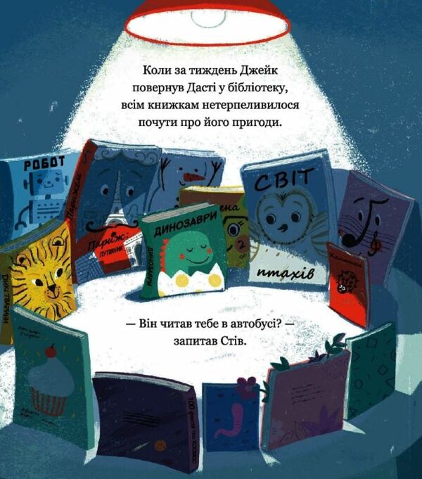 Захоплива мандрівка у таємне життя книжок із бібліотеки для читання перед сном. В основі сюжету – історії книжок про своїх читачів, якими вони діляться після закриття бібліотеки. Усі, окрім Дасті — бідолаха навіть не знає, про що йдеться на його припорошених пилом сторінках… Проте одного дня це обов’язково зміниться, адже всі ми заслуговуємо на те, щоби наші історії були почутими, чи не так? Книжка Кароліни Рабей рекомендована для спільного читання з дітьми віком від 3 років. Це чудова історія, яка захоплює читання, обмін історіями та виховання любові до книжок.