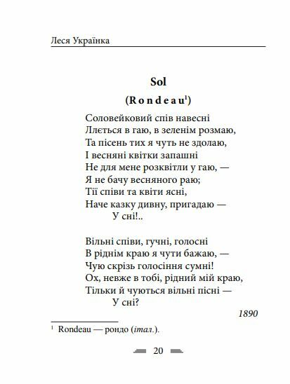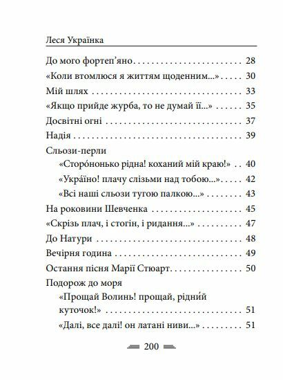 м’я видатної української поетеси Лесі Україн-ки (1871–1913) овіяне всенародною любов’ю. Вона була людиною виняткової мужності й принциповості, великої духовної краси та непересічного мистецького обдарування. Її талант яскраво проявився в поезії, драматургії, прозі, літературній критиці, перекладацтві та фольклористиці. У цій збірці вміщено 100 поезій Лесі Українки — різних за тематикою і поетичною тональністю та близьких між собою тими загальнолюдськими морально-естетичними цінностями, які притаманні всій її творчості. Вірші Лесі Українки не просто читають — їх відчувають серцем. Вони дарують нам надію та є дороговказом у житті.