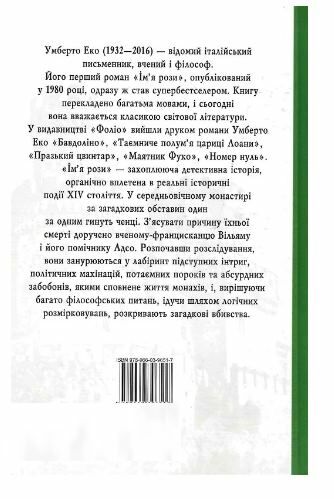 «Ім’я рози» — захоплююча детективна історія, органічно вплетена в реальні історичні події ХІV століття. У середньовічному монастирі за загадкових обставин один за одним гинуть ченці. З’ясувати причину їхньої смерті доручено вченому-францисканцю Вільяму і його помічнику Адсо. Розпочавши розслідування, вони занурюються у лабіринт підступних інтриг, політичних махінацій, потаємних пороків та абсурдних забобонів, якими сповнене життя монахів, і, вирішуючи багато філософських питань, ідучи шляхом логічних розмірковувань, розкривають загадкові вбивства.