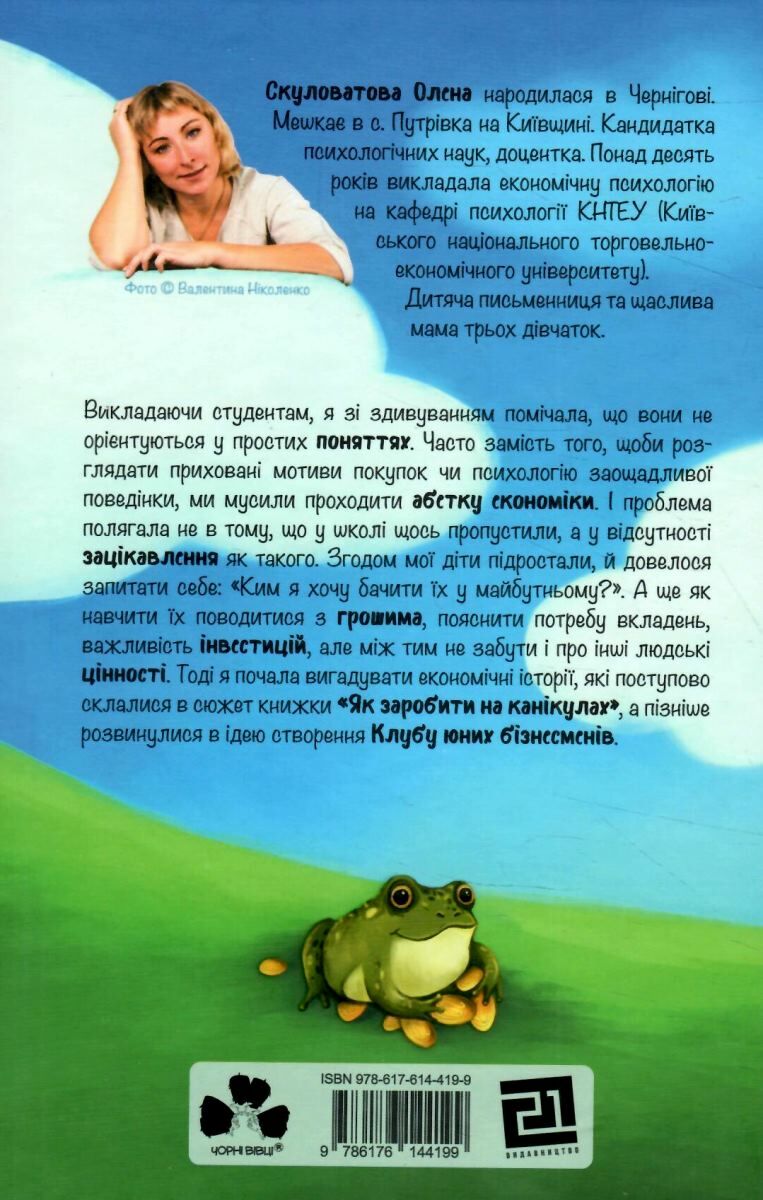 Русі скоро одинадцять. Вона мріє про новий телефон і святкову вечірку на лайнері. Але татова кав’ярня на межі банкрутства. Разом з друзями дівчинка намагається заробити гроші на мрії. Вони знаходять підробітки, випускають газету, засновують фонд, ведуть влог та інвестують у кав’ярню. Русі вдається накопичити потрібну суму, але її бажання змінюються.Економічна повість «Як заробити на канікулах» призначена дітям віком 8–12 років. Читаючи історію Русі та її друзів, вони дізнаються про заощадливу поведінку, ризик азартних ігор, фінанси, бізнес, карбування грошей, криптовалюти, роботу інвестиційного фонду, небезпеку кредитів, фінансові піраміди, різновиди реклами, продажі. Познайомляться з такими поняттями, як конкуренція, колаборація бізнесів, монополія, конкурентна розвідка, прибуток, інвестиції, капітал... Кожен розділ розкриває нову проблему і на прикладі з життя Русі пояснює її економічне значення.Але передусім повість є веселою історією із життя сучасних підлітків.