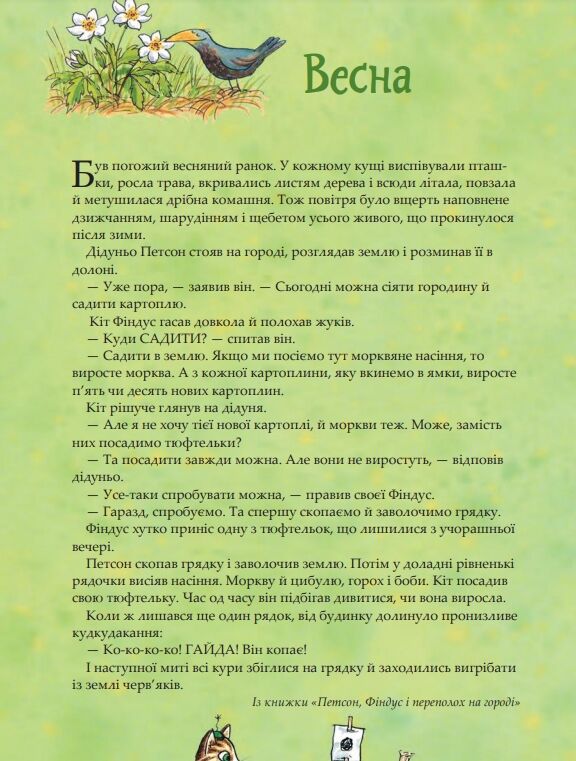 Якось кіт Фіндус помітив, що Петсон залишає свої рецепти в найнесподіваніших місцях, тож запропонував дідусеві зібрати їх в одну книжку. А надто ті рецепти, які подобаються Фіндусу та прості в приготуванні. Тоді кіт залюбки допомагав би щось готувати. Скажімо, Петсон нарізатиме цибулю й овочі, а Фіндус збиватиме вершки й ліпитиме тюфтельки. До того ж улітку треба готувати одне, а взимку — інше, бо ж не годиться, приміром, їсти різдвяну кашу напередодні свята Івана Купала. Хто-хто, а дідусь Петсон може всяке встругнути.