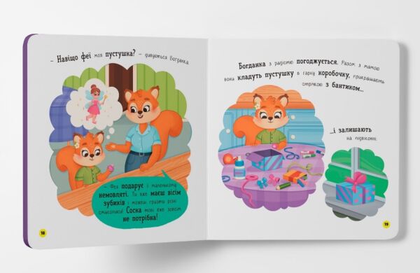 Дивлячись на білочку Богданку, дитина погодиться розлучитися з пустушкою «за компанію» і подарувати її феї. Малюк зрозуміє, що це зовсім не страшно, а навіть цікаво та весело. А якщо раптом не вийшло з першого разу — не треба засмучуватися, варто спробувати ще.