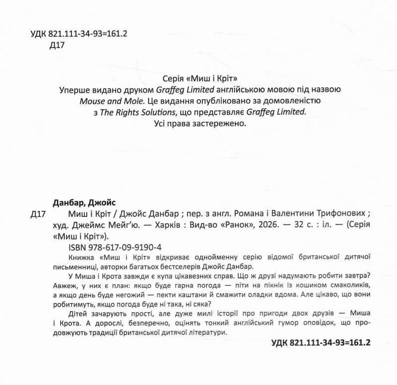 Книжка «Миш і Кріт» відкриває однойменну серію відомої британської дитячої письменниці, авторки багатьох бестселерів Джойс Данбар.