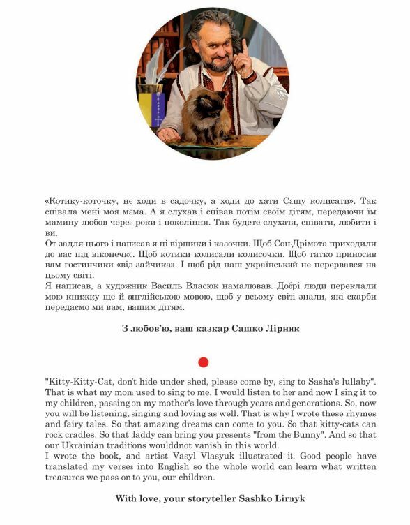 От задля цього і написав я ці віршики і казочки. Щоб Сон-Дрімота приходили до вас під віконечко. Щоб котики колисали колисочки. Щоб татко приносив вам гостинчики «від зайчика». І щоб рід наш український не перервався на цьому світі.
