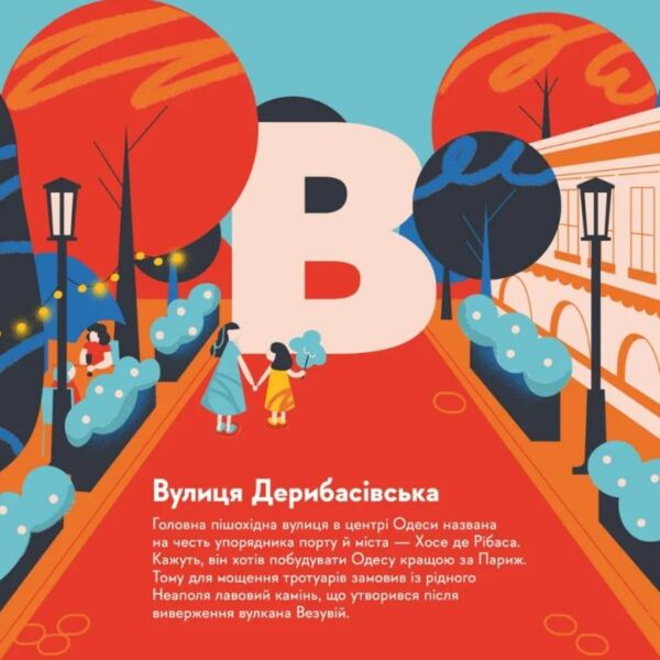 Привіт! Я — книжечка про підприємливе і самобутнє місто — Одесу. З одного боку її омиває Чорне море, а з іншого — лимани. Колись чумаки їздили сюди по сіль, а зараз зерно, яке сюди привозять, годує все Середземномор’я. Десятки народів, які проживали в Одесі, витворили її багату історію й особливий колорит. Мої автори зазирнули в кожен дворик, посмакували бичків на Привозі та спустилися в найбільші катакомби, а все для того, аби створити абетку про нашу морську столицю. Кожна літера — це ДНК міста, унікальна риса, без якої немислима його історія. А щоб Одесі не було самотньо, автори створили цілу серію книжечок про незламні міста України. Тож збирай усю сімейку і ставай домашнім експертом із історії найхоробрішої нації XXI століття.
