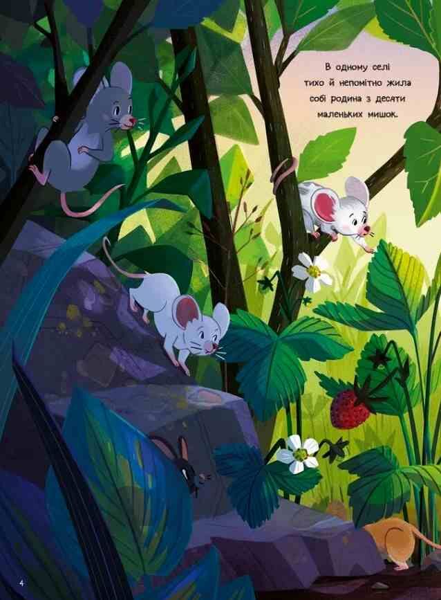 Історії про десятьох маленьких мишенят, що мешкають у тихому затишному селі. Непосиди не втрачають нагоди завітати до сусіда й «уполювати» на його кухні трохи смаколиків для всієї родини. А після ситної вечері хто ж відмовиться від запрошення на гостину до нової оселі дядечка Муло? Надто якщо той живе у музеї! Нумо рахувати мишок, відкриваючи для себе чудові витвори мистецтва! Слідуйте за десятьма в’юнкими мишачими хвостиками.