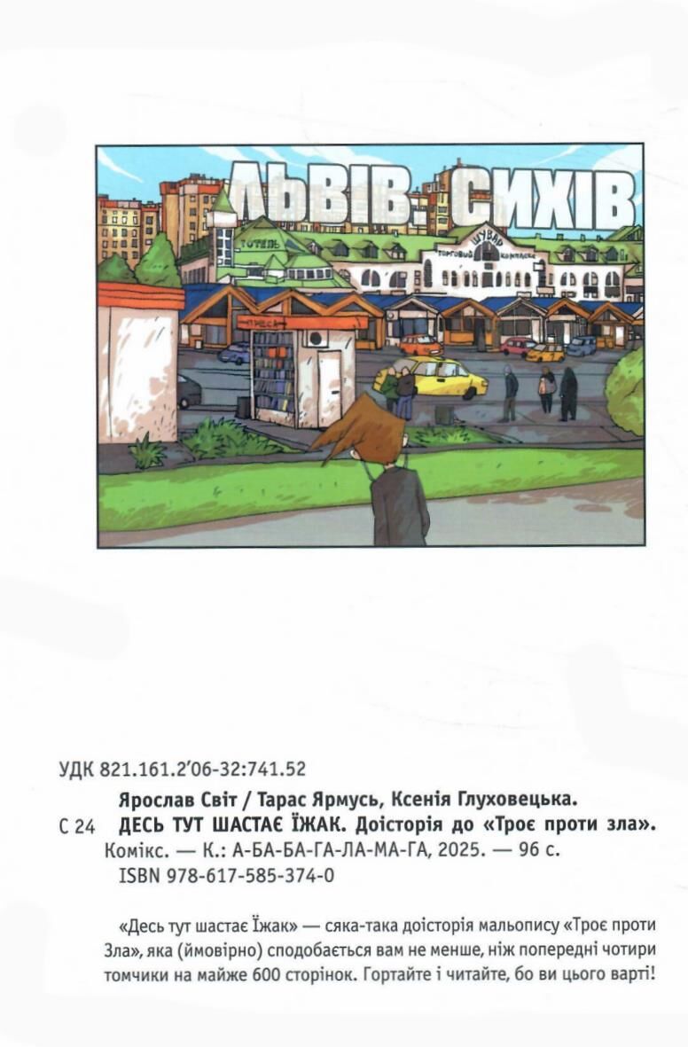 «Десь тут шастає Їжак» — це доісторія мальопису «Троє проти Зла», над яким ми працюємо з 2016-го і намалювали вже понад 600 сторінок. Якщо Ви захочете дізнатись, що ж трапилося з Антоном та Орестом із Сихова у цьому чарівному світі, як вони зустріли Їжачка... то запрошуємо у світ «Троє проти Зла»!