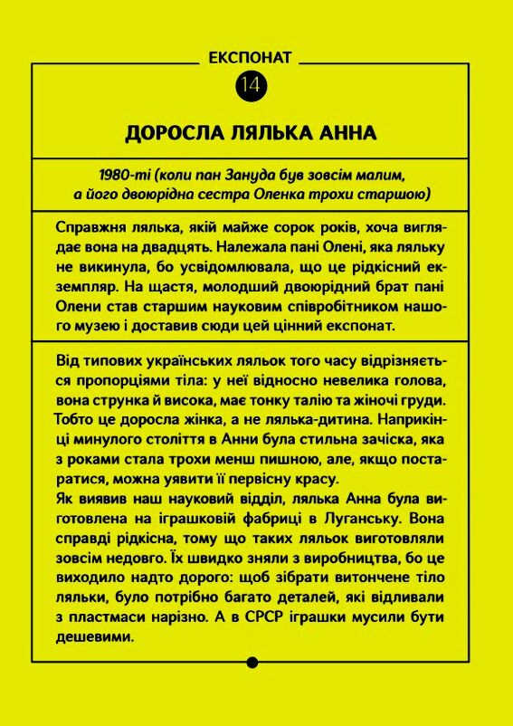 Міська дівчинка Яся змушена провести літо в селі. Там немає інших дітей, мама вся в роботі, а мамин хлопець — найнудніший у світі чоловік, пан Зануда. Але Яся знайде собі справу навіть у купі мотлоху, а зрештою заснує цілий музей. Кухонний музей іграшок минулого століття. Ходімо до неї на екскурсію: ось різні-різні іграшки радянських і пострадянських часів, ось історичні довідки, а ось — влучний гумор на додачу.
