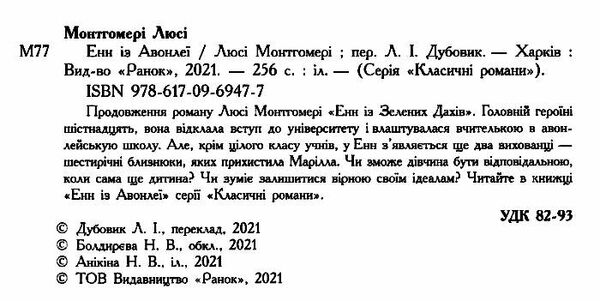 Продовження роману Люсі Мод Монтгомері «Енн із Зелених Дахів». Головній героїні шістнадцять, вона відклала плани вступити до університету і влаштувалася вчителькою в авонлейскую школу. Але крім цілого класу учнів у Ані з'являється ще два вихованці — шестирічні близнюки, яких прихистила Марілла. Чи зможе дівчина впоратися з відповідальністю, коли сама ще дитина? Чи зуміє залишитися вірною своїм ідеалам? Читайте в книзі «Аня з Авонлеі» серії «Класичні романи»..