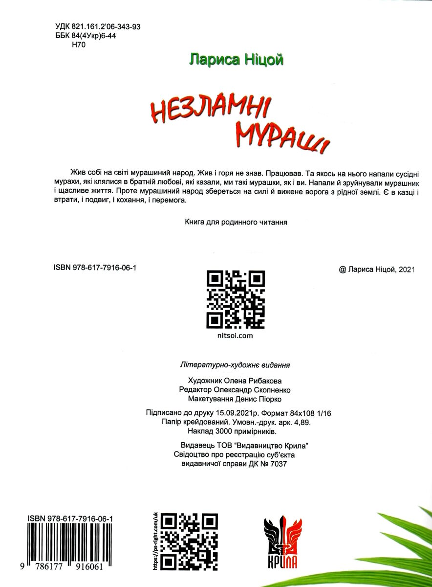 Жив собі на світі мурашиний народ. Жив і горя не знав. Працював. Та якось на нього напали сусідні мурахи, які клялися в братній любові, які казали, ми такі мурашки, як і ви. Напали й зруйнували мурашник і щасливе життя. Проте мурашиний народ збереться на силі й вижене ворога з рідної землі. Є в казці і втрати, і подвиг, і кохання, і щасливий кінець.