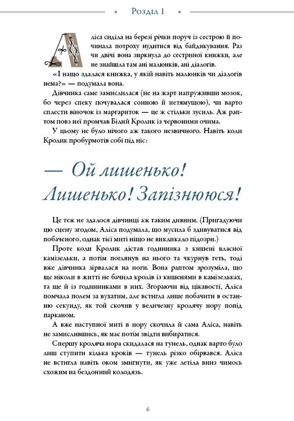 «Аліса в Країні Див» — безсмертна казкова повість Льюїса Керрола, яка протягом понад 150 років зачаровує читачів по всьому світу. Ця видатна літературна пам’ятка, перекладена десятками мов і не раз екранізована, продовжує захоплювати нові покоління дивовижними персонажами і химерними пригодами. Історія розповідає про незвичайну мандрівку дівчинки Аліси, яка потрапляє у фантастичний світ через кролячу нору. У Країні Див на неї чекають неймовірні зустрічі з незвичайними істотами, несподівані повороти сюжету та захопливі пригоди, що кидають виклик логіці та звичним уявленням про реальність. Це унікальне видання прикрашене ілюстраціями всесвітньо відомої художниці LOPUTYN, чиї роботи надають новий візуальний вимір класичній історії Керрола. Художні образи органічно поєднуються з літературним текстом, створюючи неповторну атмосферу дива і чарівності. Книга залишається актуальною і сьогодні, адже торкається вічних тем дитинства, уяви, пошуку себе та сміливості досліджувати невідоме.